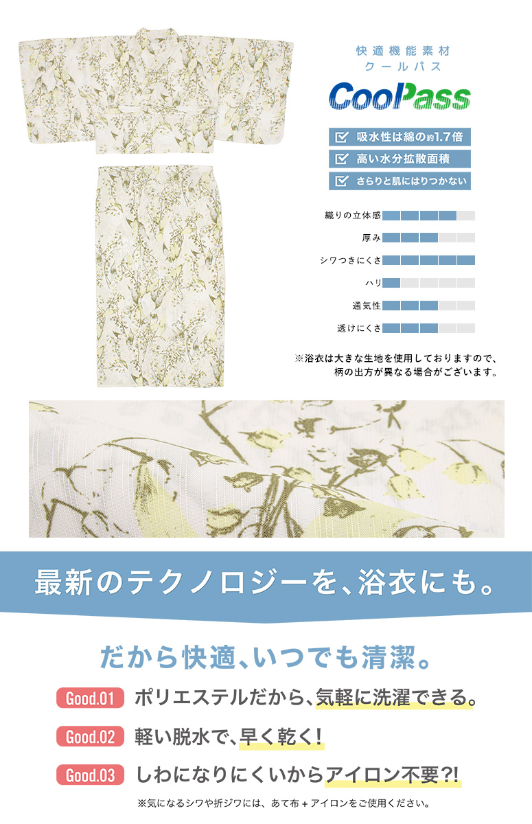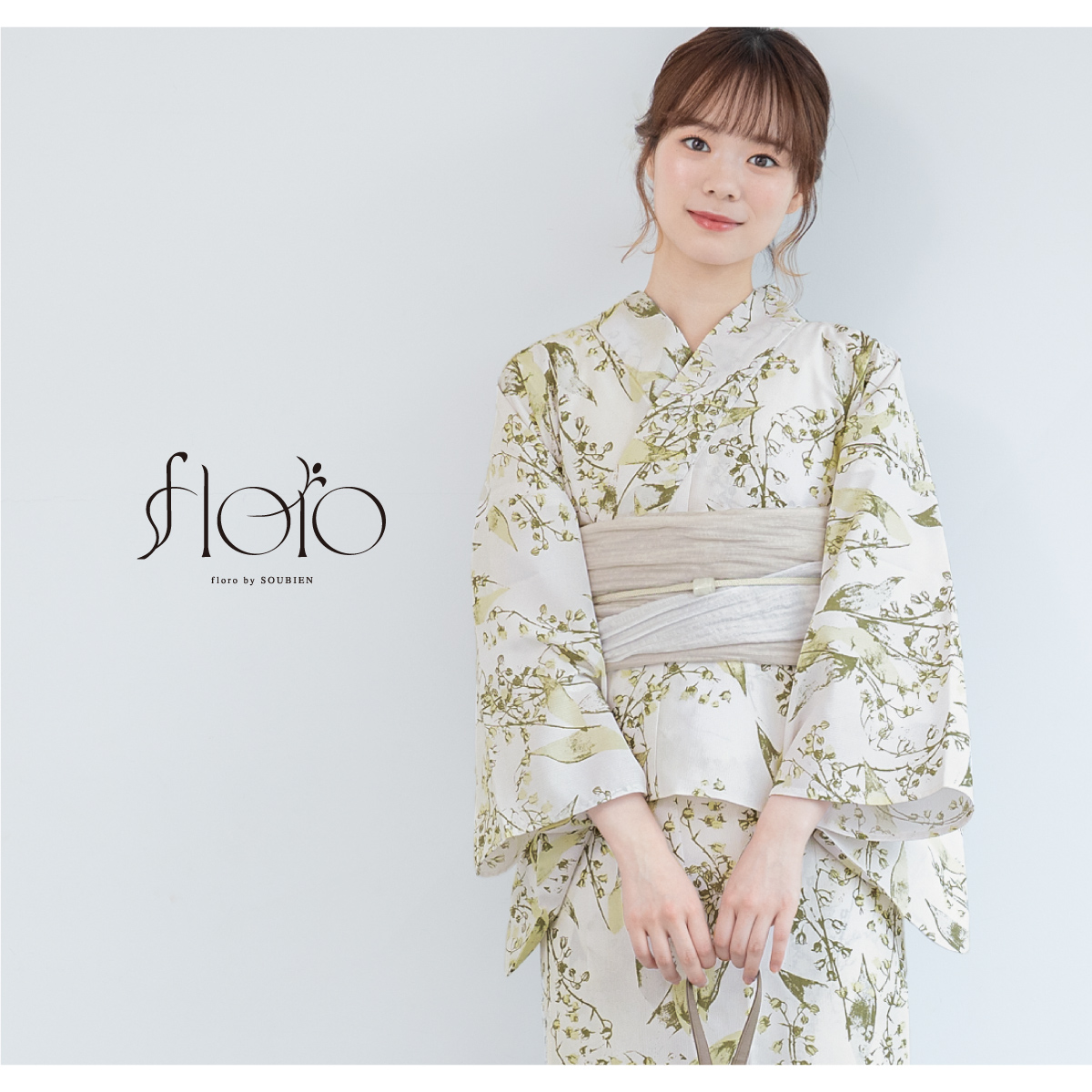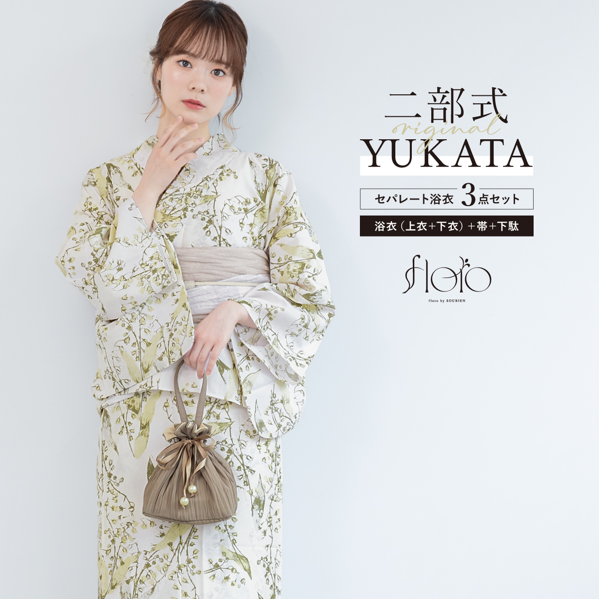浴衣 レディース セパレート浴衣 二部式浴衣 浴衣セット 夏 大人 F floro 兵児帯 下駄 白 黄緑 ベージュ 鈴蘭 花柄 女性 ゆかた ユカタ yukata モダン 創美苑