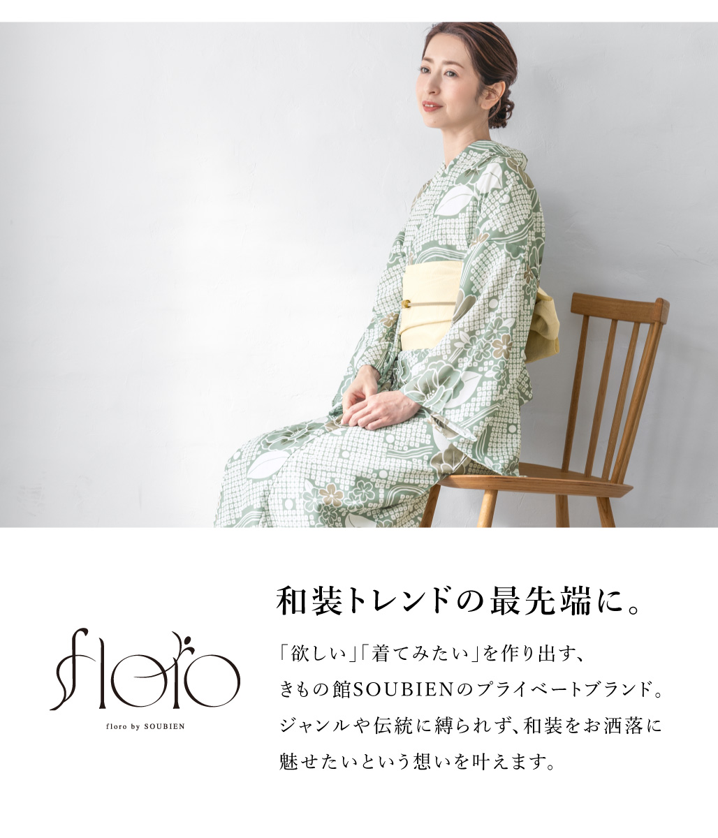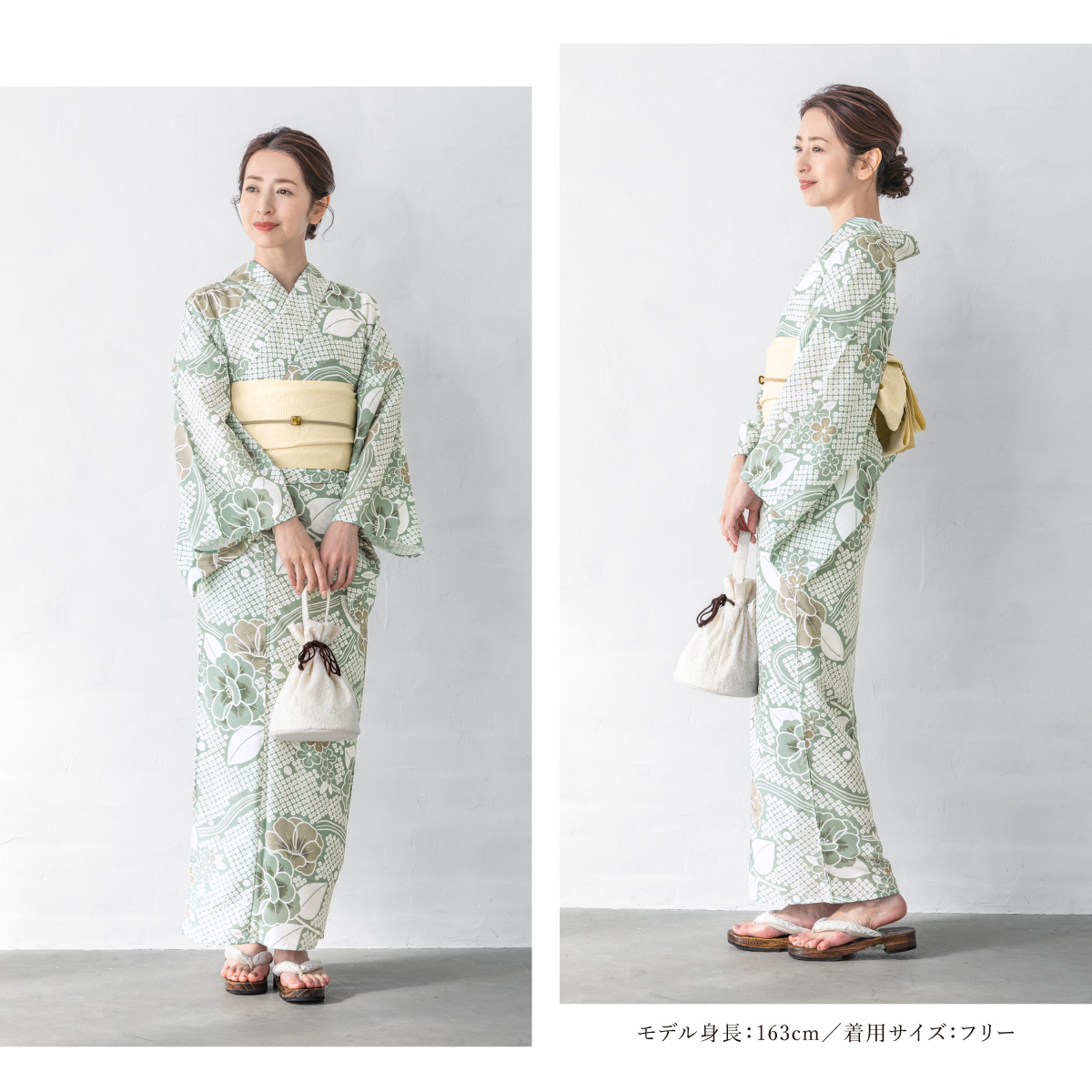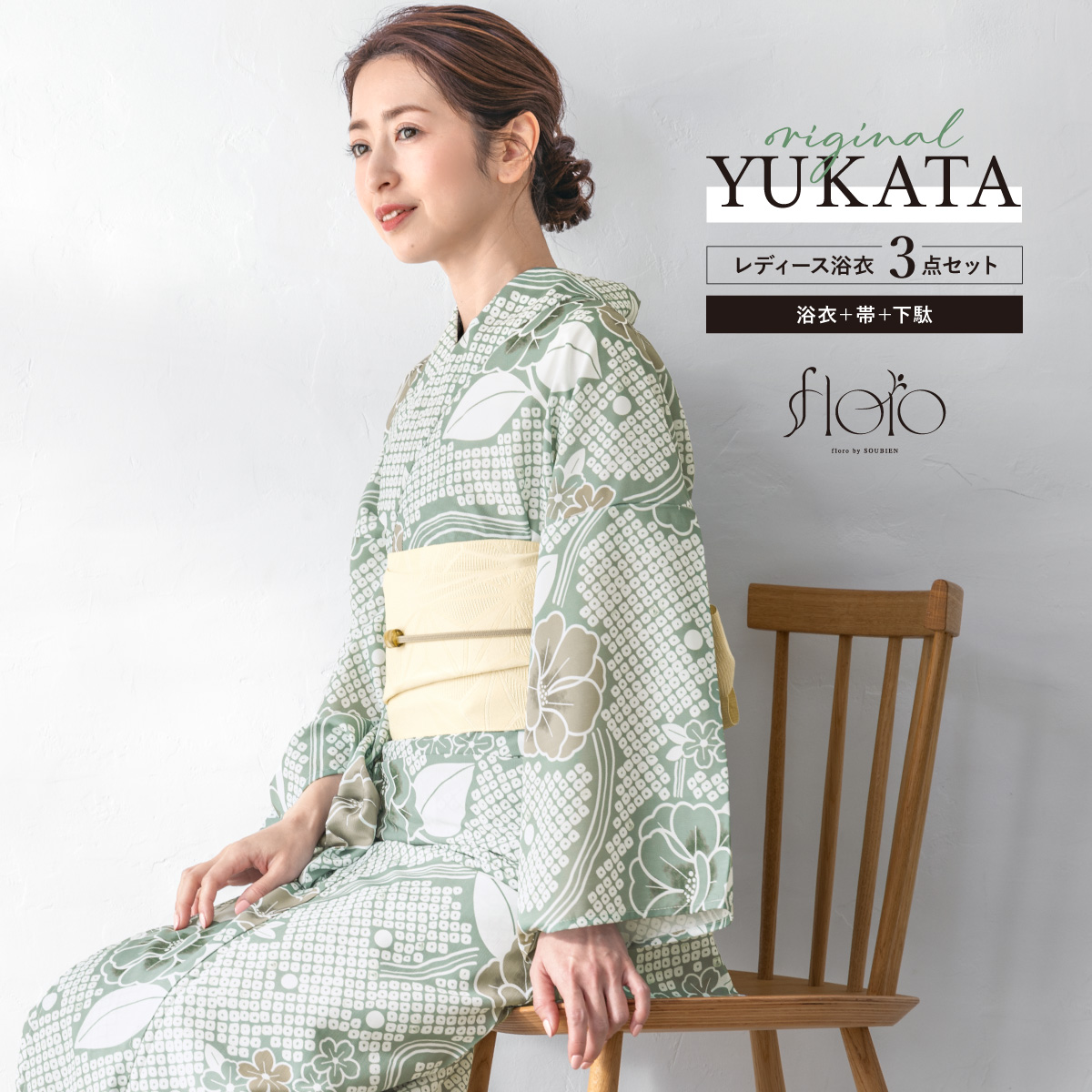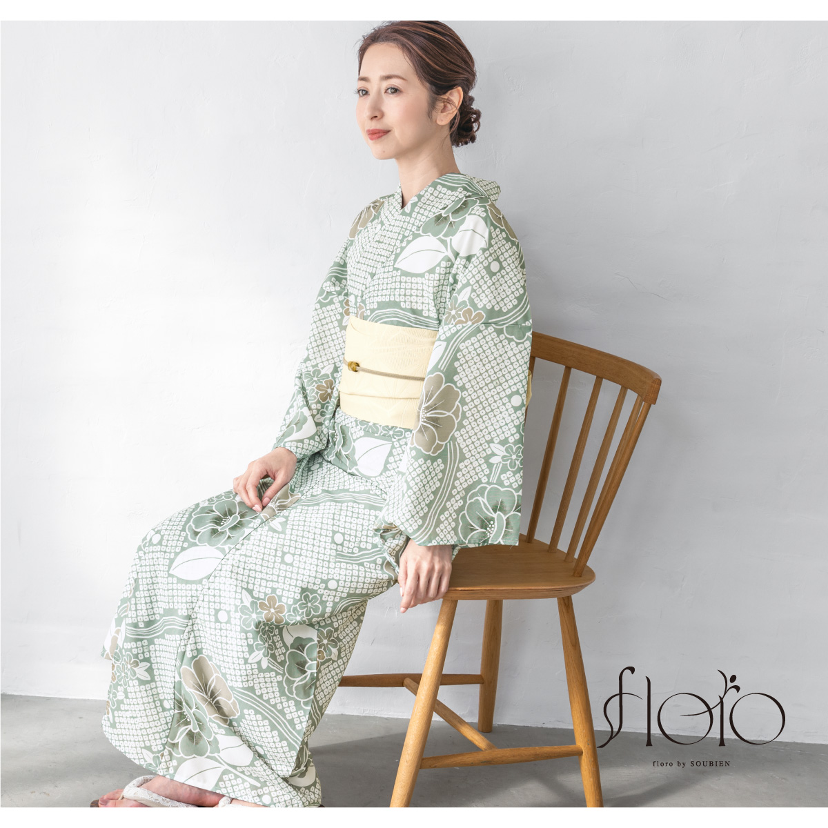 浴衣 レディース セパレート浴衣 二部式浴衣 浴衣セット 夏 大人 F 半幅帯 floro 簡単 緑 白 クリーム 牡丹 花柄 下駄 女性 ゆかた ユカタ モダン 創美苑