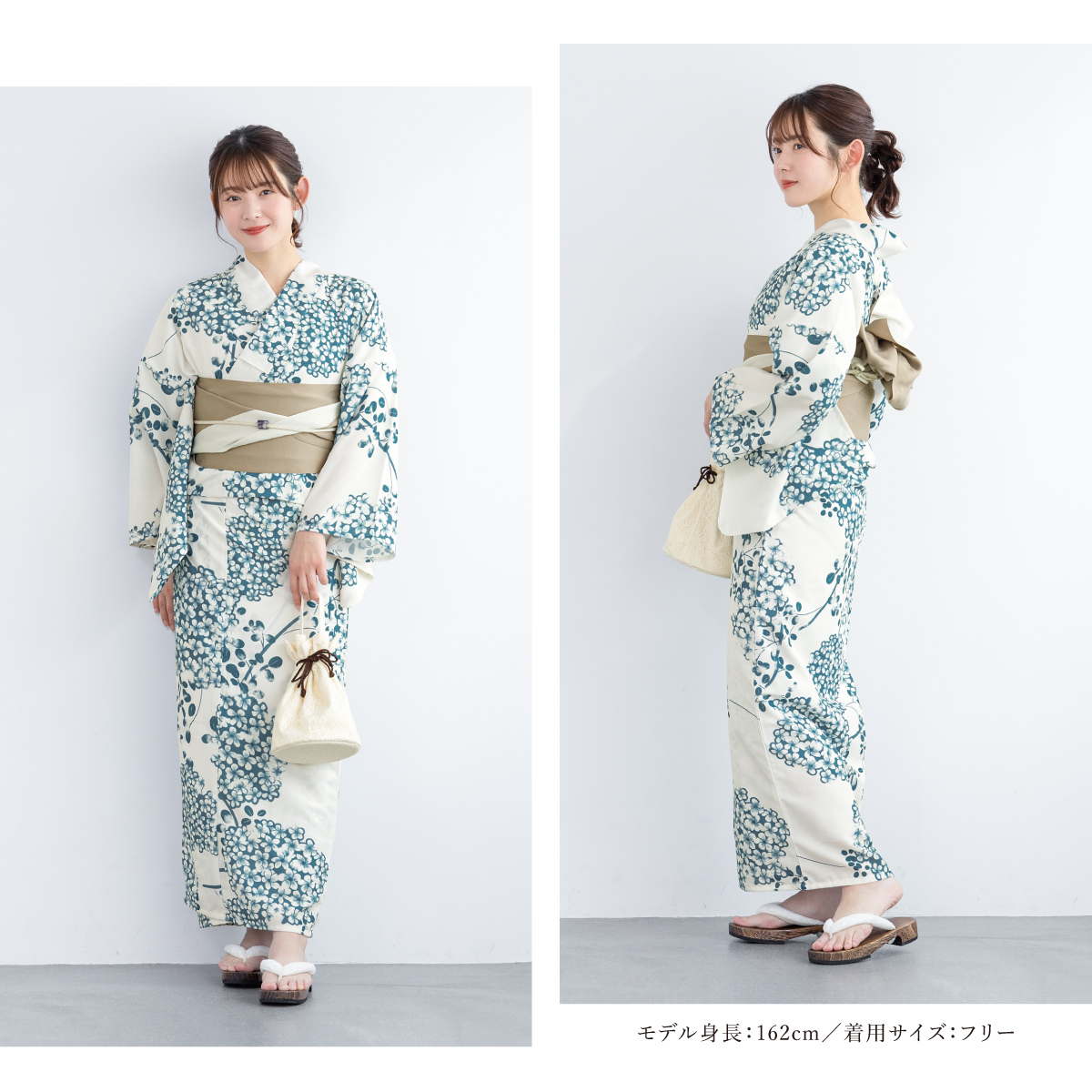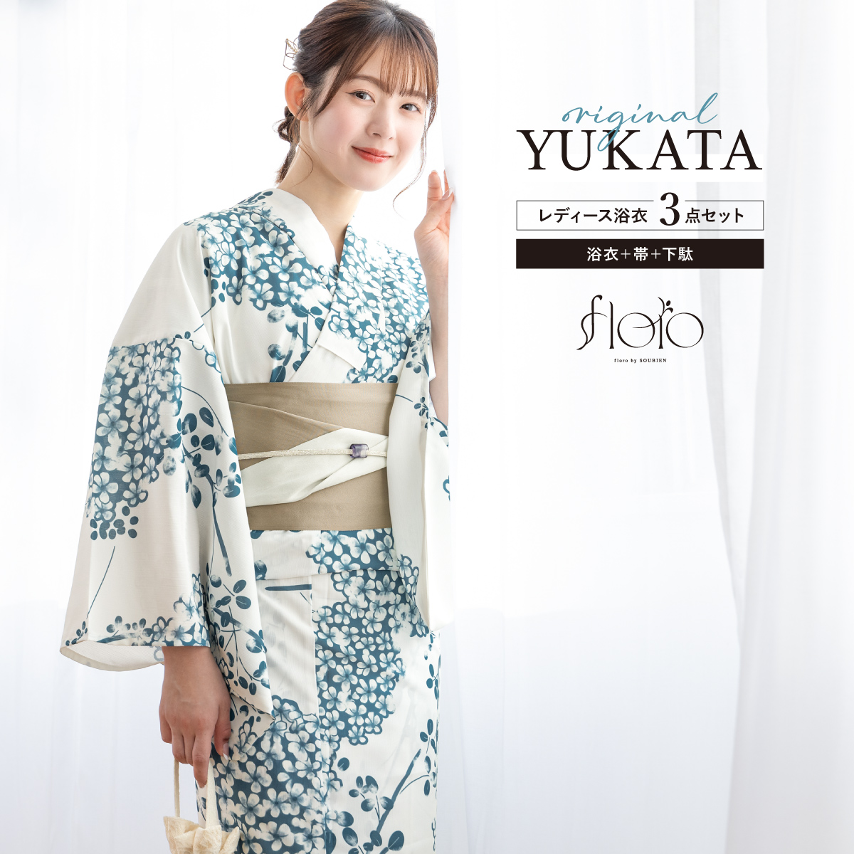 浴衣 レディース 浴衣セット 夏 大人 F 半幅帯 floro 白 青 ベージュ あじさい 下駄 レディース浴衣 女性 ゆかた ユカタ yukata モダン レトロ 創美苑