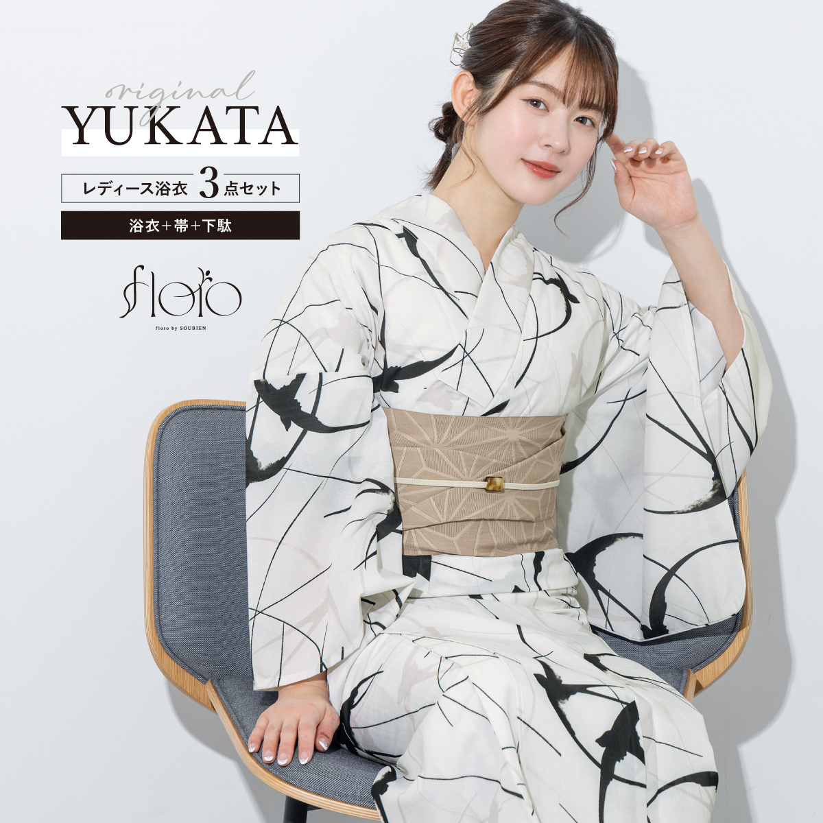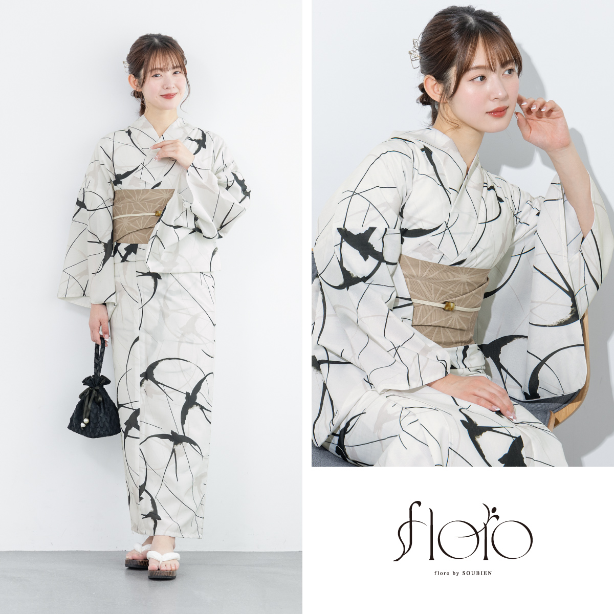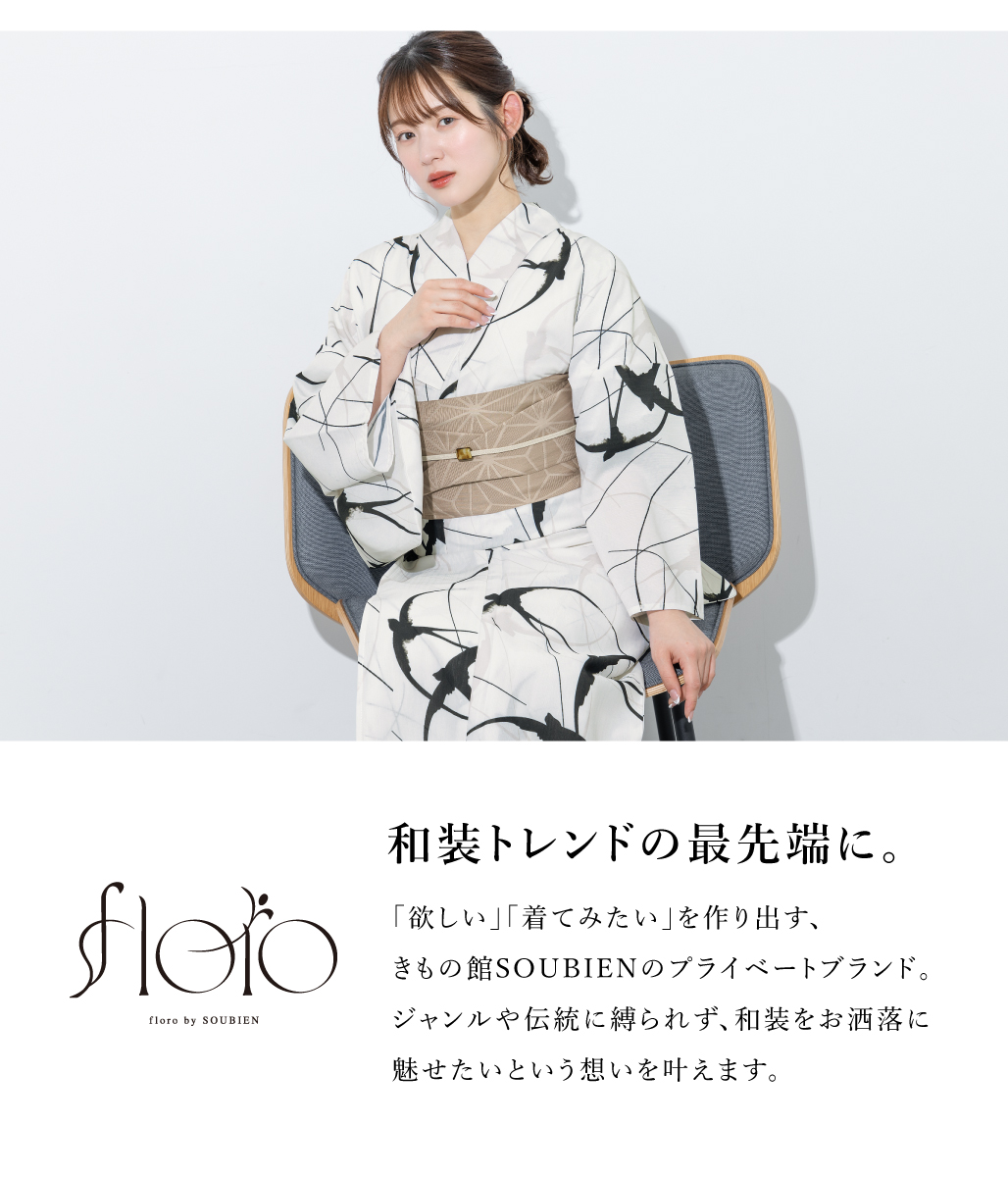 浴衣 レディース 浴衣セット 夏 大人 F 半幅帯 floro 白 黒 ベージュ おしゃれ 下駄 レディース浴衣 女性 ゆかた ユカタ yukata モダン レトロ 創美苑