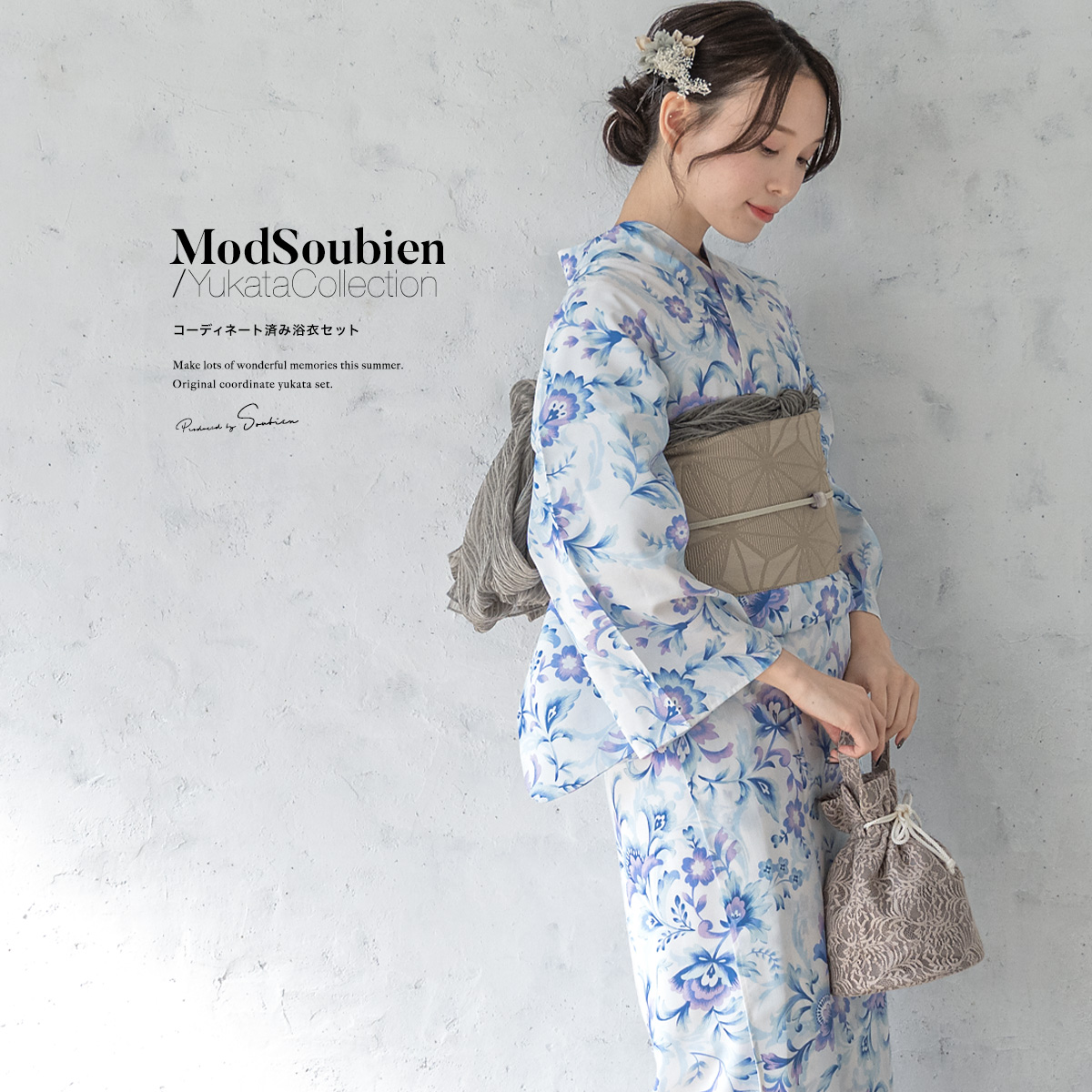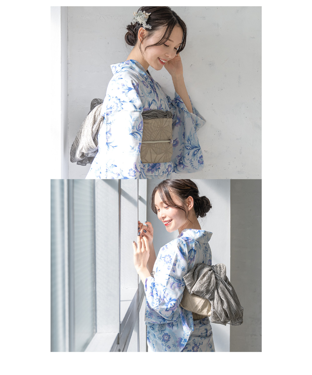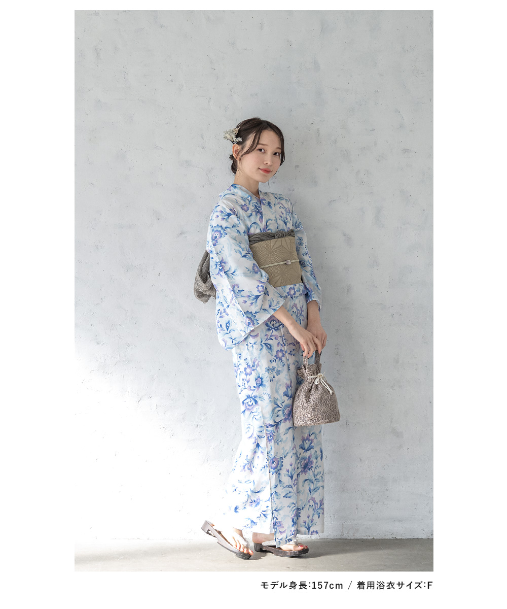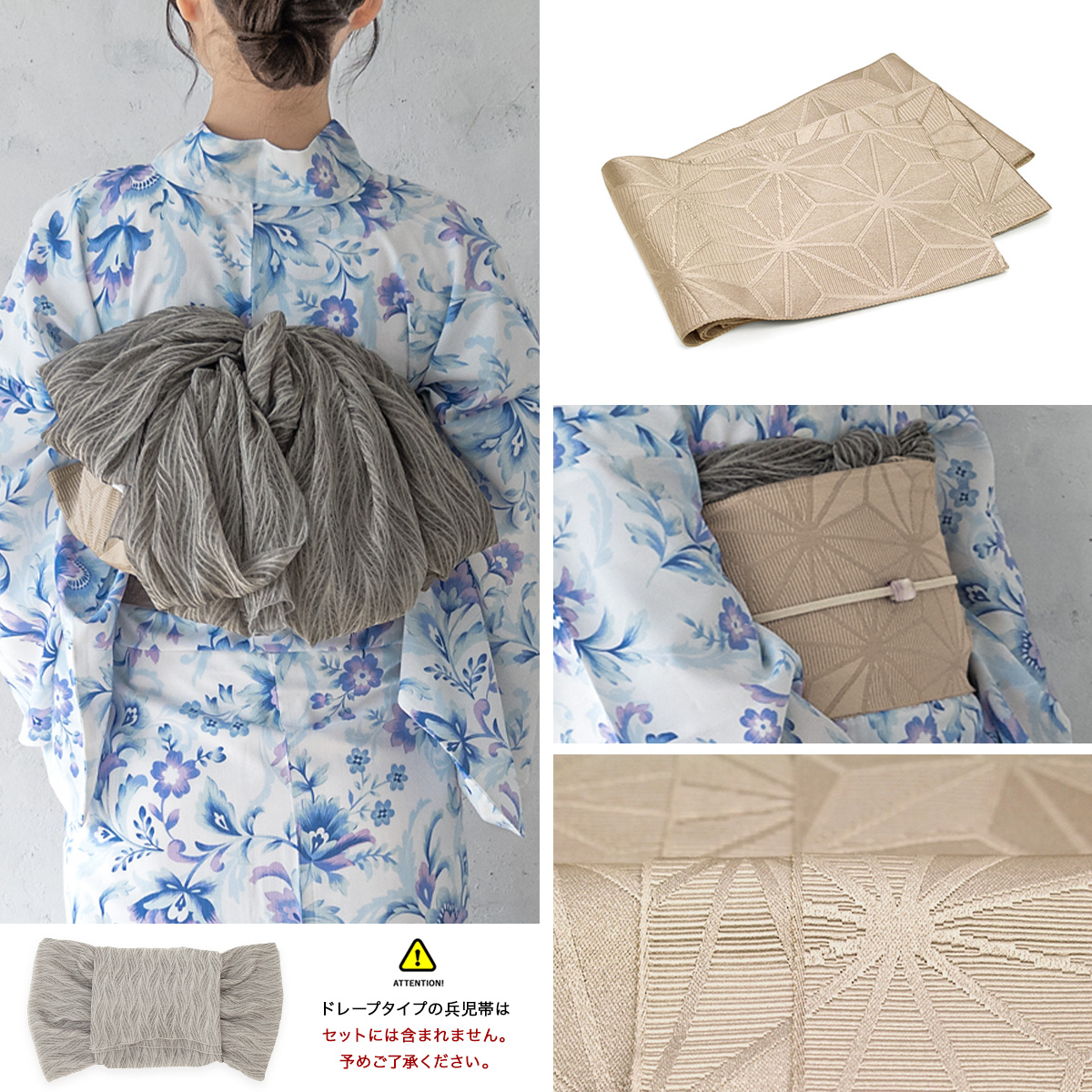 浴衣 セット レディース 浴衣セット 半幅帯 大人 3点セット ホワイト 白 青 紫 ブルー パープル 花唐草 花 モダン ベージュ S フリー 送料無料