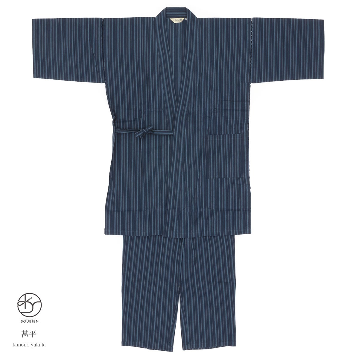 メンズ甚平 紺 ネイビー 青 縞 ストライプ 綿 しじら織り 手タコ糸仕立て 夏祭り 男性用 仕立て上がり カジュアル M L LL