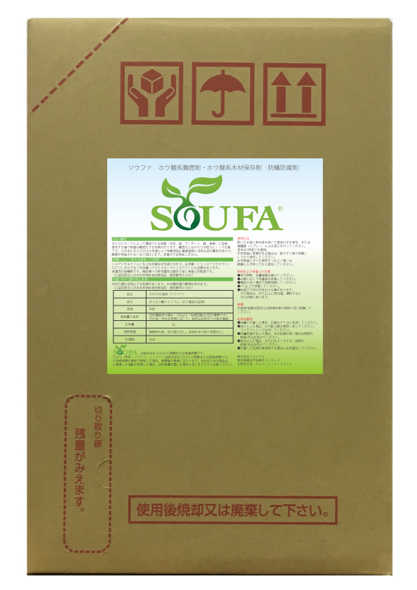SOUFA(ソウファ)はポリホウ酸ナトリウムと水のみで構成されている高濃度ホウ酸水溶液で、木材の防腐防蟻に対して効果を発揮します。あわせて難燃効果も同時に付与できます。また無機物で揮発しない為、シックハウスなどアレルギーの原因になりません。効果は半永久的で人体に対する安全性も証明されています。試験方法は京都大学および近畿大学にてJIS・K1571-2010規定に基づき実施しています。毒性は極めて低く人体への影響がない為、取り扱いは容易です。刷毛塗り、噴霧機等がご利用いただけます。標準塗布量は150g/m2。蒸発速度は「水」とほぼ同程度であり施工も容易です。