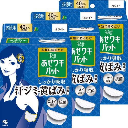 リフ あせワキパット ホワイト あせジミ防止・防臭シート(Riff 汗ワキパット)/デオドラント用品/ブランド:あせワキパット/【発売元、製造元、輸入元又は販売元】小林製薬/・単品JAN:4987072026328/【リフ あせワキパット ホワイト あせジミ防止・防臭シートの商品詳細】●衣類に貼って、汗ジミと黄ばみを防ぐ汗吸収シート●表面の汗を残しにくい吸収シート採用で、汗をすばやく引き込んでさらさら感が続く●衣類に貼りやすく動きにフィットするスリット加工で、ヨレ・ズレしにくい●瞬間吸収でさらさら続く(メッシュ素材の吸引シート)●イオン抗菌で汗のニオイを防ぐ●3層構造で、汗をしっかり吸収(1)汗をすばやく引き込む吸引シート(2)汗をたっぷり吸いとる吸水シート(3)汗をもらさないストッパーシート●はがれにくいドット形状のり●ごわごわしない約1mmの薄型シート●ホワイト:清潔感をだしたい時に・あせわきパット・気になる脇汗に・衣類に貼るだけ・しっかり吸収・汗ジミ・黄ばみ対策に・ニオイ対策・抗菌/cate35058