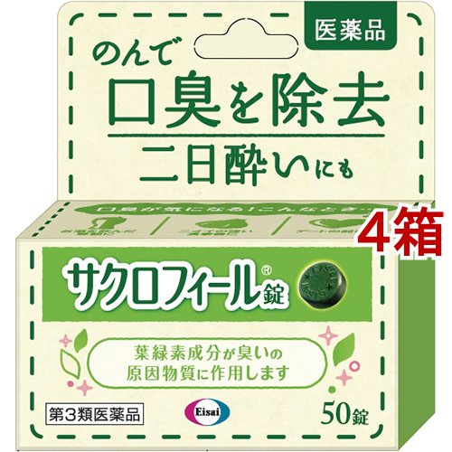 サクロフィール錠(サクロフィール)/口の薬/ブランド:サクロフィール/( 口臭 二日酔い メントール 口臭除去 )/【発売元、製造元、輸入元又は販売元】エーザイ/・単品JAN:4987028129448/【サクロフィール錠の商品詳細】●葉緑素から作られた緑の成分が、体の中で臭いの原因物質に作用し、口臭を取り除きます。●お酒を飲んだ翌日に、ニオイの強い食事後に、デートの前に/cate15168