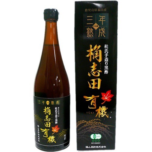 国産の有機玄米、有機玄米から造った麹、福山町の清らかな名水を使用し、通常の桷志田より1年熟成期間を延ばすことで、より一層芳醇な香りとまろやかな味わいに仕上がった黒酢(お酢)です。酸度:4.3%。有機JAS認定食品。