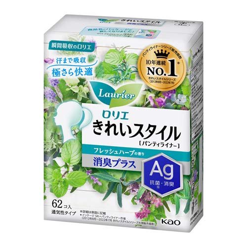 ロリエ きれいスタイル 消臭プラス フレッシュハーブの香り/生理用品/ブランド:ロリエ/【発売元、製造元、輸入元又は販売元】花王/【ロリエ きれいスタイル 消臭プラス フレッシュハーブの香りの商品詳細】●Ag消臭シートが気になるおりもののニオイを銀の力で抗菌*・消臭。●違和感なく快適なつけ心地。●汗まで吸収して、極さら快適。●おりものをしっかり閉じ込めて、さらさら感続く。●全面通気性シートで、ムレにくい。●下着にフィットして、ヨレにくい。●フレッシュハーブの香り。*すべての菌の増殖を抑制するものではありません/cate20039