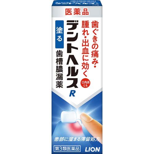 デントヘルスR/口の薬/ブランド:デントヘルス/【発売元、製造元、輸入元又は販売元】ライオン(株)/【デントヘルスRの商品詳細】●デントヘルスRは歯ぐきが腫れるなどつらい時に、指で患部に塗り込む塗布タイプの歯肉炎・歯槽膿漏薬です。●4つの有効成分が歯ぐきの痛み・腫れ・出血といった歯肉炎・歯槽膿漏の諸症状を緩和。口内炎にも効きめがあります。●有効成分がだ液に流されにくい滞留処方で、患部にしっかり留まり、すぐれた効果を発揮します。●患部に塗りやすく、爽やかな使用感のゲルタイプです。/cate15168