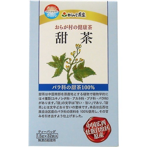おらが村の健康茶 甜茶(てんちゃ てん茶)/お茶/【発売元、製造元、輸入元又は販売元】がんこ茶家/【おらが村の健康茶 甜茶の商品詳細】●甜茶は中国南部を原産地とする植物で、植物学的には4種類(ユキノシタ科・アカネ科・ブナ科・バラ科)があります。●「甜」の文字は、「甘い・旨い」であり、「甜茶」とは文字通り甘いの意味です。●本品は広西壮族自治区産ノバラ科の原料を100%使用し、その甘みを引き出すよう仕上げました。●特に春先、季節の変り目におすすめです。●煮出しでも、水出しでもどちらでも美味しい健康茶です。/cate60957