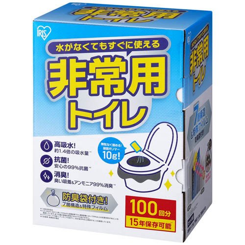 非常用トイレ 10g BTS10-100/防災用品/【発売元、製造元、輸入元又は販売元】アイリスプラザ/【非常用トイレ 10g BTS10-100の商品詳細】●水がなくてもすぐに使える、非常用トイレ。●無駄なく固める、凝固ポリマー 10g!●約5回分をまとめて廃棄できる7層構造&特殊フィルム防臭袋付き。●高吸水:約1.4倍の吸水量(※1)●抗菌:安心の99%抗菌(※2)●消臭:ニオイ吸着&アンモニア99%消臭(※3)●約15年間保存可能(※4)※1:アイリスオーヤマ従来品比。※2:JIS S0252 2021に準じて行われた試験結果です。複数菌種において99%以上の抗菌効果があることを確認しています。全ての菌の増殖を抑制するわけではありません。※3:アイリスオーヤマ調べ。アンモニアを滴下し、30分後99%以上脱臭することを確認しています。※4:未使用、未開封の場合。/cate30454