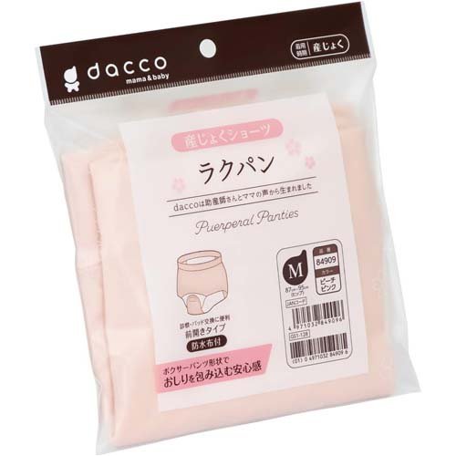 ダッコ ラクパン 前開き産褥ショーツ M ピンク(dacco)/マタニティ/ブランド:ダッコ(dacco)/【発売元、製造元、輸入元又は販売元】オオサキメディカル/【ダッコ ラクパン 前開き産褥ショーツ M ピンクの商品詳細】●幅広ベルトでお腹を締め付けないため、快適に着用できます。●伸縮性のある、肌にやさしい良質のストレッチコットン素材を使用し、体にフィットし、お産用パッドのズレやヨレを防ぎます。●幅の広い防水布が前モレをしっかりガードし、ウエストまである防水布が後ろモレをしっかりガードするため夜も安心です。●股下部分が開くため、ショーツを着用したままでお産用パッドの交換ができます。/cate25335