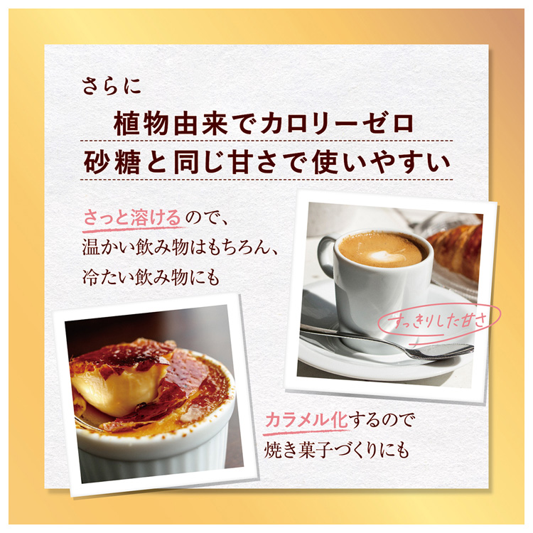 ●メーカー従来品のラカントSより溶けやすく、ジャムやぜんざいを作っても析出(冷めても表面から固まらない)せず、砂糖と同じようにカラメル化ができるといった特徴を持つ、料理好きの方も必見の甘味料です。