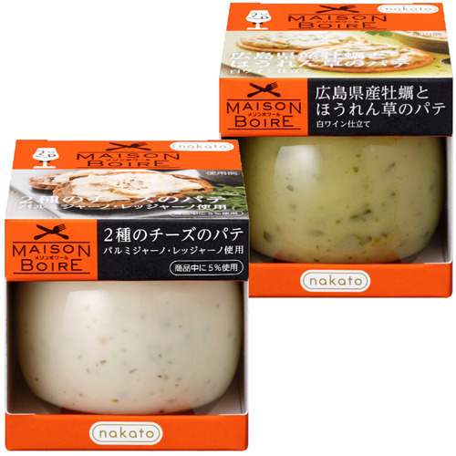 メゾンボワール 2種のチーズのパテ&広島県産牡蠣とほうれん草のパテ/缶詰類/ブランド:メゾンボワール/【発売元、製造元、輸入元又は販売元】nakato/【メゾンボワール 2種のチーズのパテ&広島県産牡蠣とほうれん草のパテの商品詳細】●ワインにぴったりなパテです。●2種のチーズのパテ パルミジャーノ・レッジャーノ使用パルミジャーノ・レッジャーノとプロセスチーズを使った濃厚な味わいに、ハーブとレモンを加えさわやかに仕上げました。●広島県産牡蠣とほうれん草のパテ 白ワイン仕立て広島県産の牡蠣とほうれん草のペーストに、ざく切りのきのこを加え、白ワインで仕上げました。/cate45780