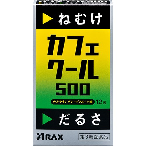 カフェクール500/眠気ざまし/【発売元、製造元、輸入元又は販売元】アラクス/【カフェクール500の商品詳細】●カフェクール500はシャキーン!!としたCoolな刺激がうれしい、ほろ苦酸っぱいグレープフルーツ味の眠気防止薬です。●3包中に無水カフェイン500mgを配合したうえ、口溶けのよい白色の顆粒剤なので、眠ってはいけないときにねむけを感じたら、1日3回まで服用可能、どこでも水なしでも服用できます。/cate15228