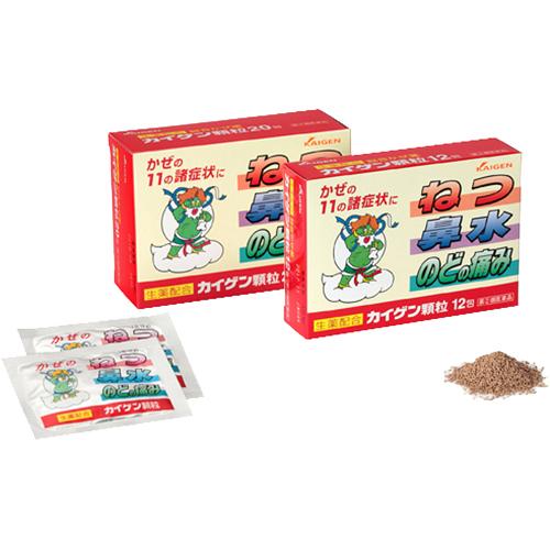 ●カイゲン顆粒は、発熱や悪寒、頭痛、鼻水、せきなど、かぜの諸症状の緩和に効果をあらわす非ピリン系で、生薬を配合した顆粒状のかぜ薬です。