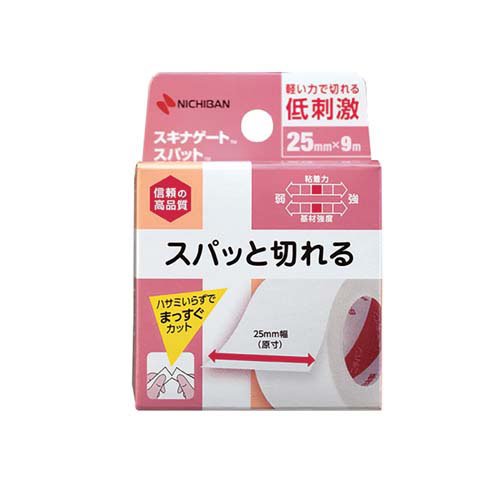 ニチバン スキナゲート スパット SGS259 25mm*9m/衛生用品/【発売元、製造元、輸入元又は販売元】ニチバン/【ニチバン スキナゲート スパット SGS259 25mm*9mの商品詳細】●お肌の弱い方にもお使いいただける刺激の少ないテープです。●力の弱い方でも手で簡単にスパっと切れます。●テープ表面に1mm間隔の溝を施し、テープを凹凸にしました。切るときに凹部に力が集まるので、軽い力でまっすぐに切ることができます。●刺激の少ないアクリル系粘着剤に通気孔を設け、空気や水蒸気が通りやすい構造としました。また、粘着剤が柔らかいので、はがす際の痛みや、角質のはがれが軽減されます。●透湿性が高いので、ムレによるはがれが起きにくく、しっかり固定できます。●ガーゼや包帯等の固定に。/cate20270