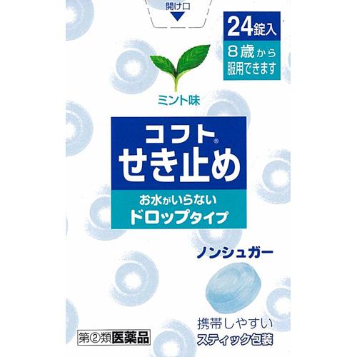 コフトせき止め(コフトせきどめ コフトせき止 コフト咳止め コフト咳止 コフト咳どめ)/風邪薬/ブランド:コフト/【発売元、製造元、輸入元又は販売元】日本臓器製薬/【コフトせき止めの商品詳細】●水なしで服用できるドロップタイプのせき止め薬を携帯しやすいスティック包装に4錠ずつ入れてありますので、外出先でのせき止めに最適です。●せきの原因である狭くなった気管支を拡張させるdL-メチルエフェドリン塩酸塩配合により、すぐに止めたいせきによく効きます。●アレルギー性のせきを鎮めるd-クロルフェニラミンマレイン酸塩配合●成分は承認基準の1日最大量を配合しています。●ぜんそく性のせきやたんにもご使用いただけます。●ノンシュガー。1回2錠当たり6キロカロリーです。●さわやかミント味/cate15103