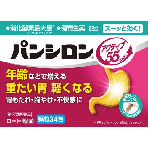 パンシロン アクティブ55/胃腸薬/ブランド:パンシロン/( 年齢などで増える重たい胃 健胃生薬配合 胃薬 )/【発売元、製造元、輸入元又は販売元】ロート製薬/【パンシロン アクティブ55の商品詳細】●パンシロン アクティブ55は年齢などで増える重たい胃や、胃もたれ・胸やけ・不快感に効く胃腸薬です。●3種の消化酵素を補い、消化を助けます。●生薬(ケイヒ末)の力で、胃腸を元気に動かします。●薬の配合成分が気になる方におすすめの処方設計。*原薬としてナトリウム・アルミニウム・ロートエキスを配合しておりません。(生薬由来のナトリウム、アルミニウムは含む場合があります。)●塩辛くなく、スーッと爽快な服用感。ご年配の方やお子さま(3才から服用可)にも。/cate15113