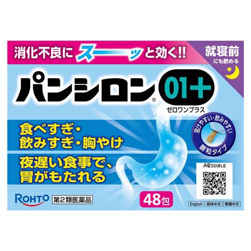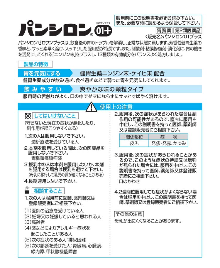 パンシロン01プラス/胃腸薬/ブランド:パンシロン/【発売元、製造元、輸入元又は販売元】ロート製薬/【パンシロン01プラスの商品詳細】●食べすぎ・飲みすぎ・胸やけや、夜遅い食事で胃がもたれるなどの不快な症状に効く胃腸薬です。●胃をスーッとさせる速効性制酸剤と持続性制酸剤、荒れた胃粘膜を整える粘膜修復剤と健胃剤、さらに消化を促進する消化酵素など、胃腸薬の基本機能に必要な有効成分をバランスよく配合しました。●すっきりとのみやすい服用感です。【販売名】パンシロン01プラス/cate15113