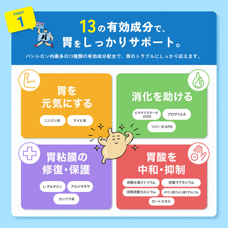 ●胃をスーッとさせる速効性制酸剤と持続性制酸剤、荒れた胃粘膜を整える粘膜修復剤と健胃剤、さらに消化を促進する消化酵素など、胃腸薬の基本機能に必要な有効成分をバランスよく配合しました。