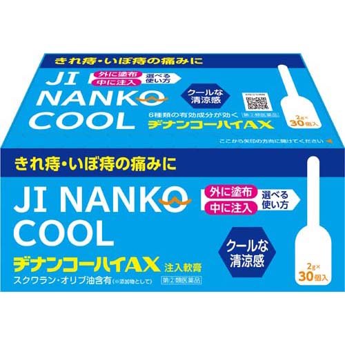 ヂナンコーハイAX(痔ナンコーハイAX)/尿のトラブル・痔の薬/ブランド:ヂナンコー/( いぼ痔 きれ痔 注入軟膏 15歳以上 )/【発売元、製造元、輸入元又は販売元】ムネ製薬/【ヂナンコーハイAXの商品詳細】●抗炎症作用のあるヒドロコルチゾン酢酸エステルをはじめ、有効成分を軟膏状にして、使いやすい注入式容器に入れた痔疾用薬です。●局所麻酔作用のあるリドカインで痛み・かゆみを鎮めます。●ヒドロコルチゾン酢酸エステルと酸化亜鉛で出血を止め、はれを抑え、患部を保護します。●ご使用の前に入浴又はぬるま湯を用い、ガーゼなどで患部をきれいにしますと、一層効果的です。●排便時の痛みが激しい時は、1時間ほど前に注入しておきますと、排便時の痛みをやわらげ、便の通りをよくします。/cate15188