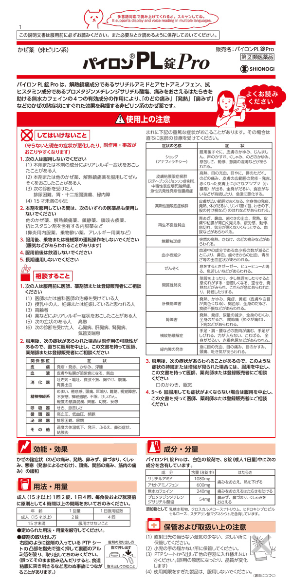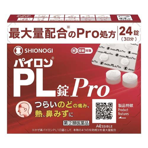 パイロンPL錠Pro/風邪薬/ブランド:パイロン/【発売元、製造元、輸入元又は販売元】シオノギヘルスケア/【パイロンPL錠Proの商品詳細】●解熱鎮痛成分であるサリチルアミドとアセトアミノフェン、抗ヒスタミン成分であるプロメタジンメチレンジサリチル酸塩、痛みをおさえるはたらきを助ける無水カフェインの4つの有効成分の作用により、「のどの痛み」「発熱」「鼻みず」などのかぜの諸症状にすぐれた効果を発揮する非ピリン系のかぜ薬です。【販売名】パイロンPL錠Pro/cate15103