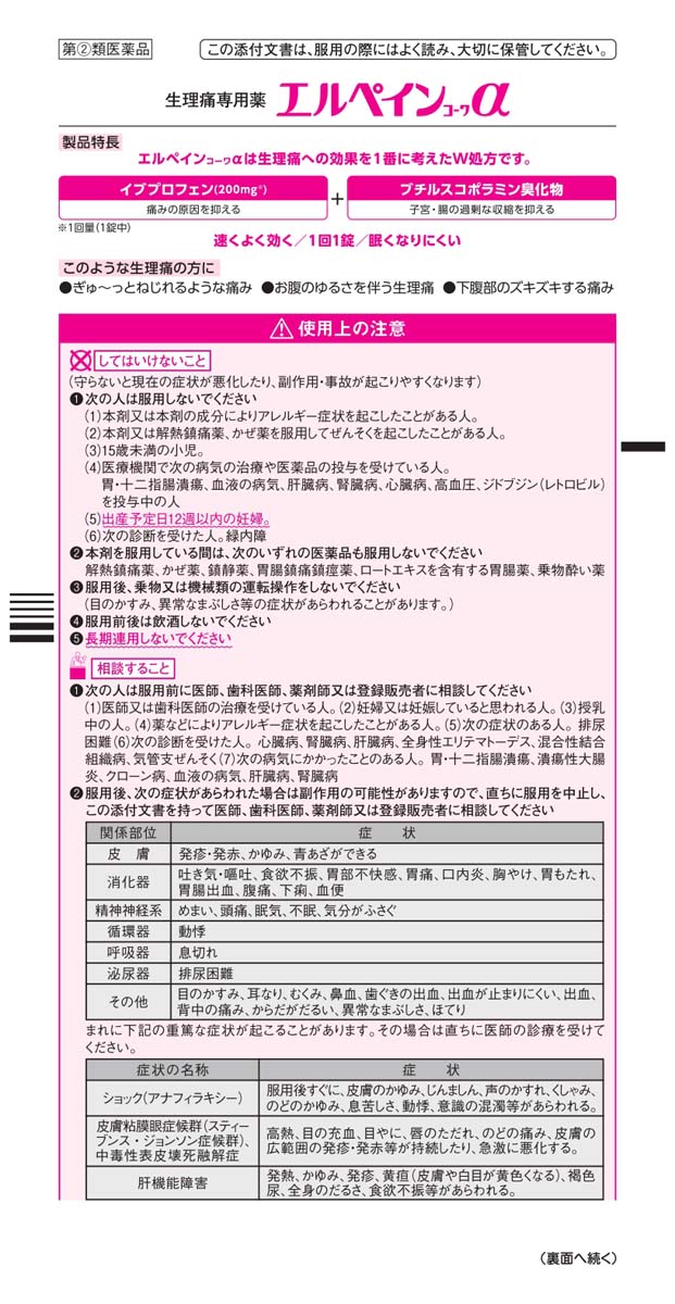 エルペインコーワα/貧血・婦人薬/ブランド:エルペイン/【発売元、製造元、輸入元又は販売元】興和/【エルペインコーワαの商品詳細】●一般的な解熱鎮痛薬とは異なり、「生理痛」専用の効果・効能をもつ鎮痛薬です。●生理特有の痛みに、速くよく効きます。●「ぎゅ〜っとねじれるような痛み」や「お腹のゆるさを伴う生理痛」に直接作用●1回1錠、眠くなりにくい【販売名】エルペインコーワα/cate15208