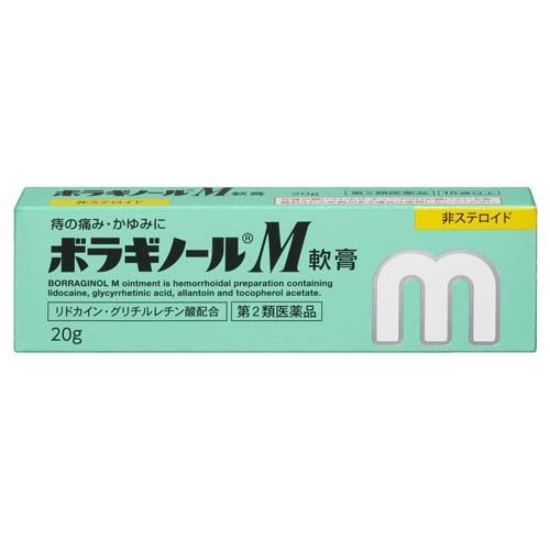 ボラギノールM軟膏/尿のトラブル・痔の薬/ブランド:ボラギノール/【発売元、製造元、輸入元又は販売元】天藤製薬/【ボラギノールM軟膏の商品詳細】●4種の成分がはたらいて、痔による痛み・かゆみにすぐれた効果を発揮します。・リドカインが痛み、かゆみをしずめます。グリチルレチン酸が炎症をやわらげ、痔の症状の緩和をたすけます。・アラントインが傷の治りをたすけ組織を修復するとともに、ビタミンE酢酸エステルが血液循環を改善し、痔の症状の緩和をたすけます。●使いやすさを考え、なめらかですべりのよい油脂性基剤を使用しています。・刺激が少なく、油脂性基剤が傷ついた患部を保護します。・白色〜わずかに黄みをおびた白色の軟膏です。【販売名】ボラギノールM軟膏/cate15188