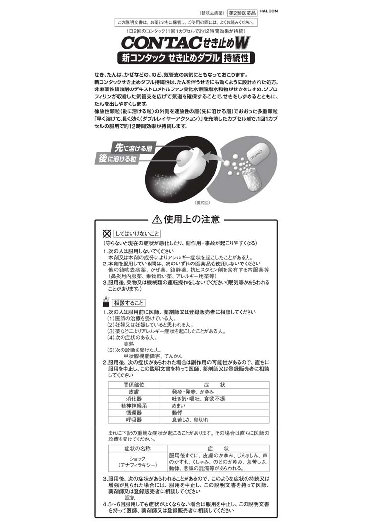 新コンタック せき止めダブル持続性(1日2回 コデイン(麻薬性鎮咳成分)無配合 デキストロメトルファン臭化水素酸塩水和物 ジプロフィリン 咳 セキ こんたっく)/風邪薬/ブランド:コンタック/【発売元、製造元、輸入元又は販売元】Haleonジャパン株式会社/・単品JAN:4987246602129/【新コンタック せき止めダブル持続性の商品詳細】●せき、たんは、かぜなどの、のど、気管支の病気にともなっておこります。新コンタックせき止めダブル持続性は、たんを伴うせきにも効くように設計された処方。●非麻薬性鎮咳剤のデキストロメトルファン臭化水素酸塩水和物がせきを鎮め、ジプロフィリンが収縮した気管支を広げて気道を確保することで、せきを鎮めるとともにたんを出しやすくします。●徐放性顆粒(後に溶ける粒)の外側を速放性の層(先に溶ける層)でおおった多重顆粒「早く溶けて、長く効く(ダブルレイヤーアクション)」を充填したカプセル剤で、1回1カプセルの服用で約12時間効果が持続します。/cate15103