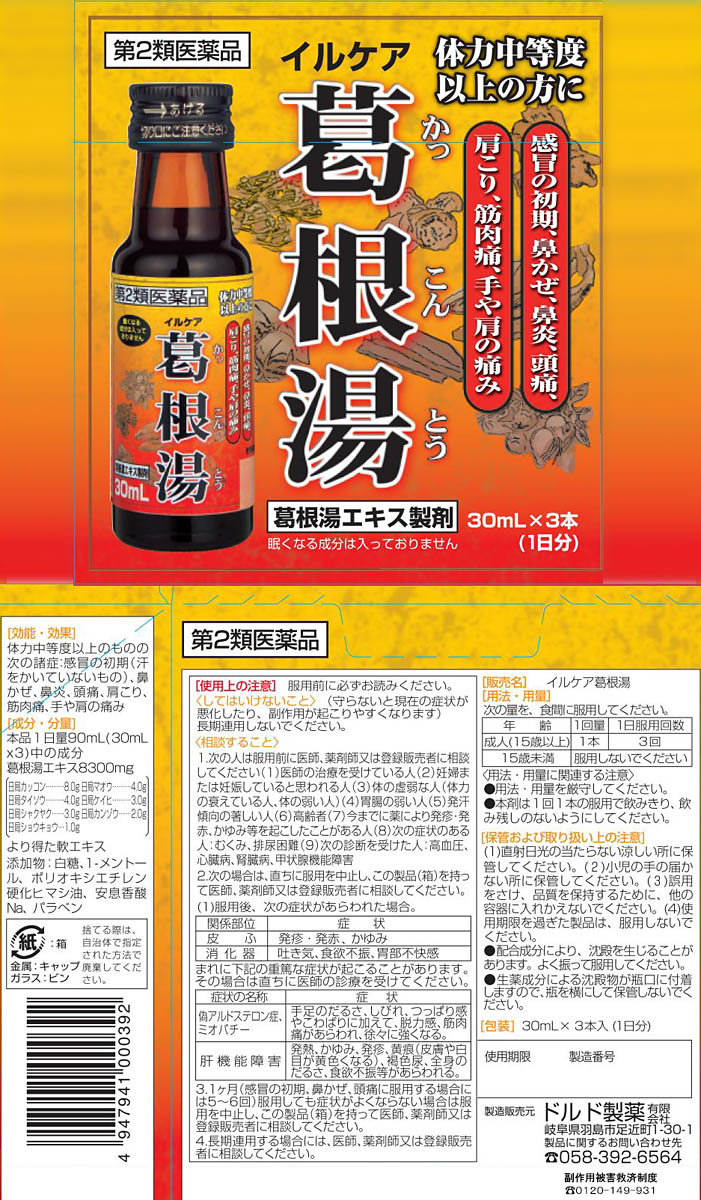 イルケア 葛根湯(カッコントウ)/風邪薬/ブランド:イルケア/【発売元、製造元、輸入元又は販売元】ドルド製薬/・単品JAN:4947941000392/【イルケア 葛根湯の商品詳細】●感冒の初期、鼻かぜ、鼻炎、頭痛、肩こり、筋肉痛、手や肩の痛みに●体力中等度以上の方に●眠くなる成分は入っておりません。●内服液/cate15103