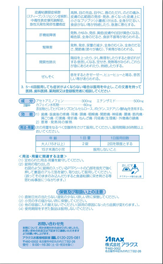 アセトアミノフェン:300mg、エテンザミド:500mg、カフェイン水和物:60mg