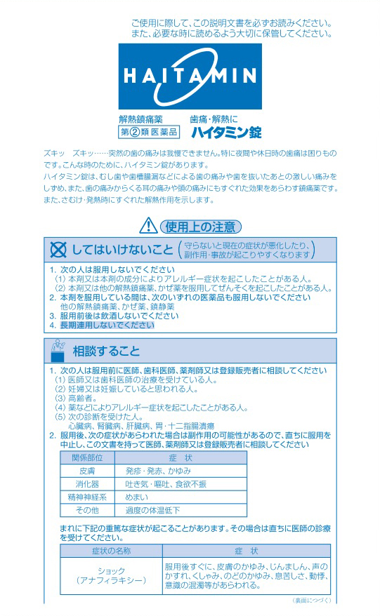 ●ハイタミン錠は、むし歯や歯槽膿漏などによる歯の痛みや歯を抜いたあとの激しい痛みをしずめ、また、歯の痛みからくる耳の痛みや頭の痛みにもすぐれた効果をあらわす鎮痛薬です。また、さむけ・発熱時にすぐれた解熱作用を示します
