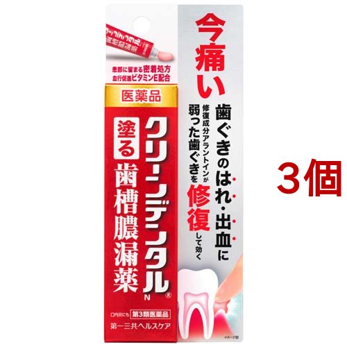 クリーンデンタルN(歯ぐきのはれ・出血に クリーンデンタル 歯槽膿漏薬 軟膏)/口の薬/ブランド:クリーンデンタル/【発売元、製造元、輸入元又は販売元】第一三共ヘルスケア/・単品JAN:4987107617477/【クリーンデンタルNの商品詳細】●歯ぐきのはれ、出血、痛み、うみ等発症してしまった歯肉炎・歯槽膿漏の症状や口内炎に、血行を促進するトコフェロール酢酸エステル(ビタミンE)や歯肉炎・歯槽膿漏の原因となる細菌の増殖をおさえる殺菌成分等、すぐれた効果を発揮する5種類の有効成分配合。●患部に長く留まる密着処方で、だ液に流されにくい滞留性軟膏タイプなので、歯ぐきにしっかり留まり、5種類の有効成分が効果を発揮します。●指で塗りこむ軟膏タイプで、歯ぐきに直接作用します。/cate15168