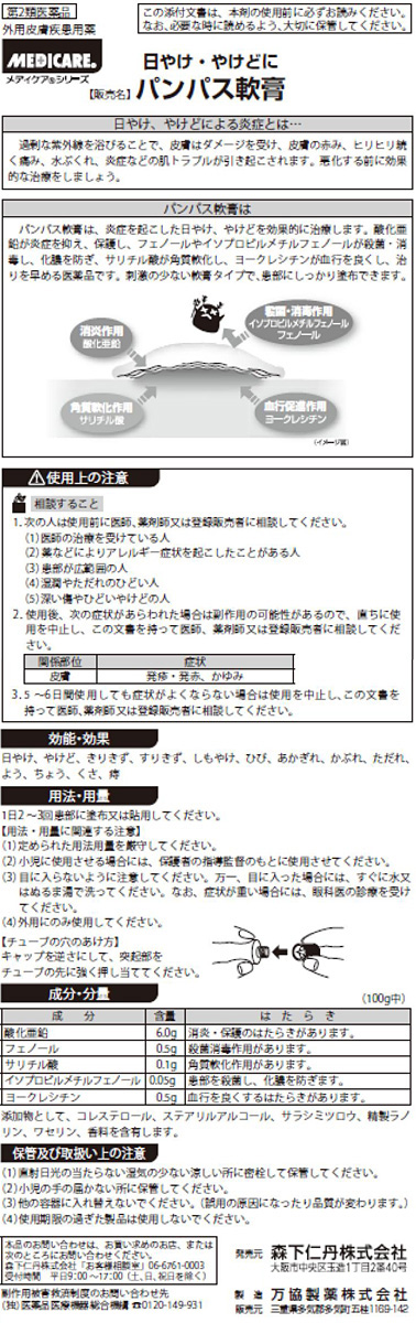●パンパス軟膏は、炎症を起こした日やけ、やけどを効果的に治療します。酸化亜鉛が炎症を抑え、保護し、フェノールやイソプロピルメチルフェノールが殺菌・消毒し、化膿を防ぎ、サリチル酸が角質軟化し、ヨークレシチンが血行を良くし、治りを早める医薬品です。