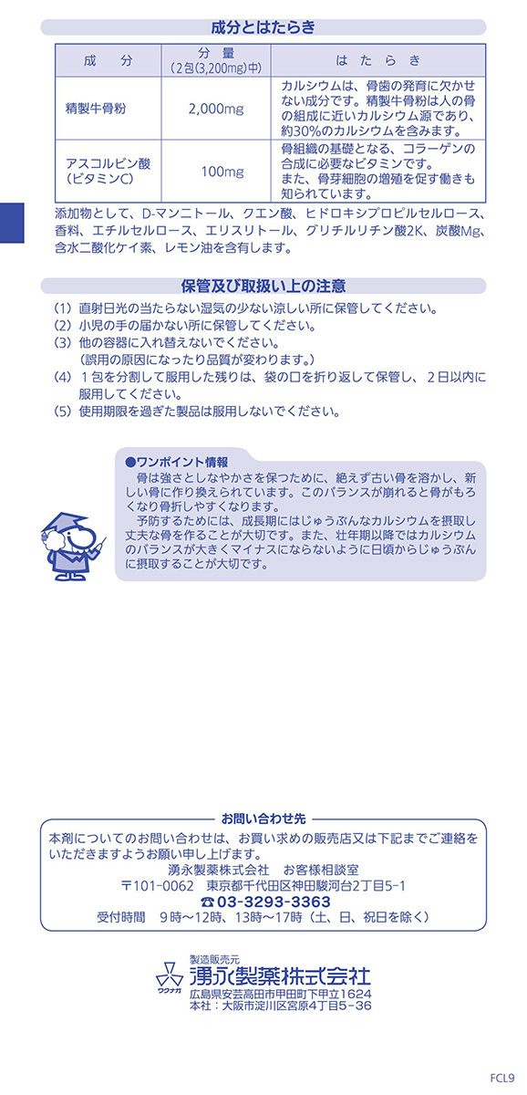 ●本剤には、2包中にカルシウム約600mgとビタミンC100mgが含まれており、骨歯の発育を促進し、妊娠授乳期の骨歯の脆弱化を防ぎます。また、その他のミネラルとしてリン約270mg、マグネシウム約60mgを含有します。