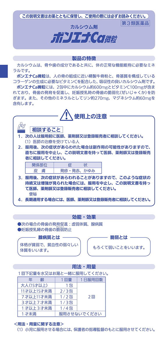 ボンエナCa微粒/ビタミン剤・栄養剤/【発売元、製造元、輸入元又は販売元】湧永製薬/・単品JAN:4968250219220/【ボンエナCa微粒の商品詳細】●カルシウムは、骨や歯の成分であると共に、体の正常な機能維持に必要なミネラルです。●ボンエナCa微粒は、人の骨の組成に近い生成牛骨粉と、骨基質を構成しているコラーゲンの生成に必要なビタミンCを配合した、吸収性の良いカルシウム剤です。●本剤には、2包中にカルシウム約600mgとビタミンC100mgが含まれており、骨歯の発育を促進し、妊娠授乳期の骨歯の脆弱化を防ぎます。また、その他のミネラルとしてリン約270mg、マグネシウム約60mgを含有します。/cate15133