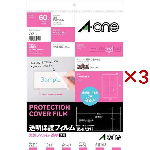 エーワン 透明 保護 フィルム 光沢 透明 10面 96×52mm 79210(A-ONE A・ONE)/文房具/ブランド:エーワン/【発売元、製造元、輸入元又は販売元】スリーエムジャパン/・単品JAN:4906186792103/【エーワン 透明 保護 フィルム 光沢 透明 10面 96×52mm 79210の商品詳細】●透明フィルムを使用した保護用のラベルです。●ラベルの上に貼りすることで、水・汚れ・こすれからラベルの表面を守ります。●エーワンのOAラベルに合わせたサイズで、ご使用の紙ラベルやフィルムラベルを補強します。/cate30452