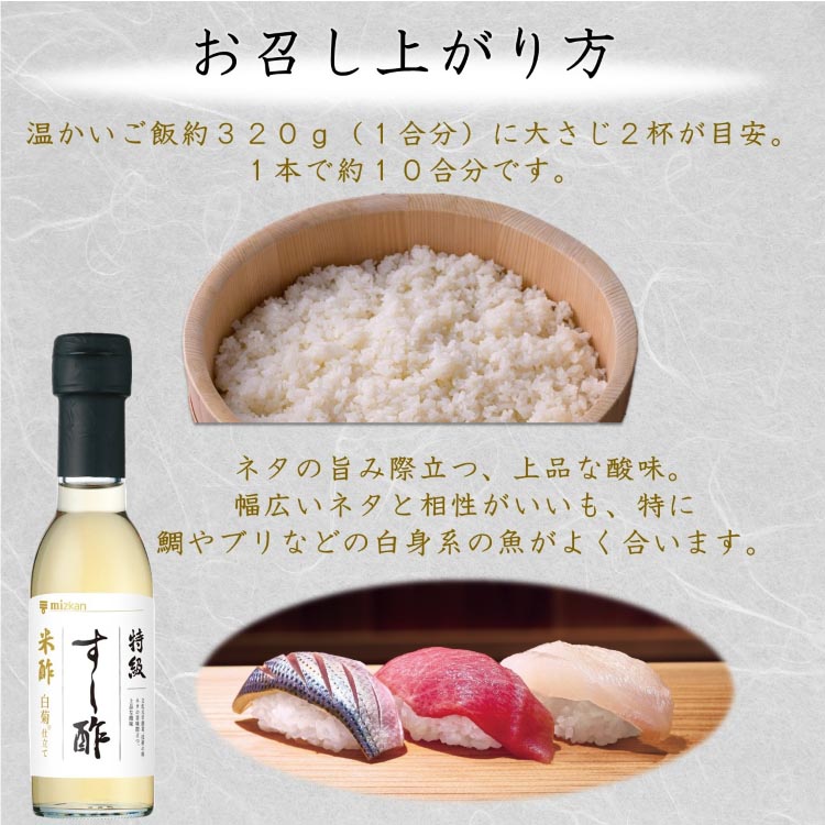 ●創業二百年以上の歴史とノウハウを活かし、ミツカン米酢の「白菊」をベースに調合した、家庭でこだわりの詰まった味わいが楽しめる、特級のすし酢(寿司酢)です。