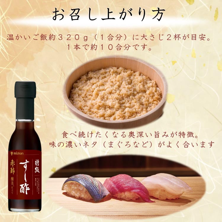 ●創業二百年以上の歴史とノウハウを活かし、ミツカン赤酢(粕酢)の自信作「醸美(かもしび)」をベースに調合した、家庭でこだわりの詰まった味わいが楽しめる、特級のすし酢です。