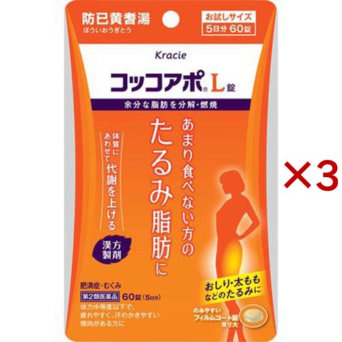 コッコアポL錠/漢方薬/【発売元、製造元、輸入元又は販売元】クラシエ薬品/・単品JAN:4987045100369/【コッコアポL錠の商品詳細】●下半身が太くみえるむくみとは筋力が弱い方や疲れやすい方は、水分代謝が悪く、余分な水分が重力などで下に溜まりやすくなるため、特に夕方以降下半身にむくみが起きやすくなります。これにより、脚などが太くみえてしまいます。また、むくみを放っておくと、下半身に余分な脂肪がつく原因のひとつとなると言われています。●コッコアポL錠は、防已黄耆湯(ボウイオウギトウ)という漢方。こちらの漢方は水分代謝を上げて、むくみの原因となる余分な水分を減らします。また、脂質代謝を上げてしまりのない余分な脂肪を分解・燃焼して減らします。これらにより、むくみや水太りに働きかけます。/cate15233