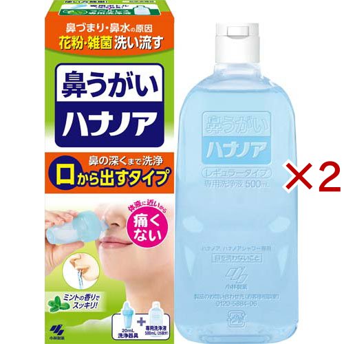 ハナノア 鼻うがい 口から出すしっかりタイプ/衛生器具/ブランド:ハナノア/【発売元、製造元、輸入元又は販売元】小林製薬/・単品JAN:4987072061282/【ハナノア 鼻うがい 口から出すしっかりタイプの商品詳細】●鼻の奥までしっかり洗える!洗浄液を鼻から入れて口から出すので、鼻の奥深くに付着した花粉や雑菌をしっかり洗い流すことができます●鼻にしみない、痛くない!体液に近い成分でできているので、鼻がツーンと痛くなりません●簡単に鼻うがいができる!ノズルを鼻の穴に入れ、洗浄液を流し込むだけで、簡単に鼻うがいができます●ミントの香りでスッキリ!鼻の奥までミントの香りが広がり、スッキリ爽やかになります●「鼻うがい」って何?ハナノアaは鼻の奥深くにあたる上咽頭(じょういんとう)まで洗うことができるので、鼻をかむより簡単にすっきりとした感覚になります。【販売名】ハナノアa/cate20275