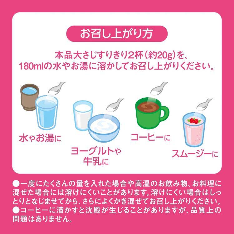 脱脂粉乳(国内製造)、コラーゲンペプチド、乳酸菌(殺菌)/V.C、ピロリン酸鉄、(一部に乳成分・ゼラチンを含む)