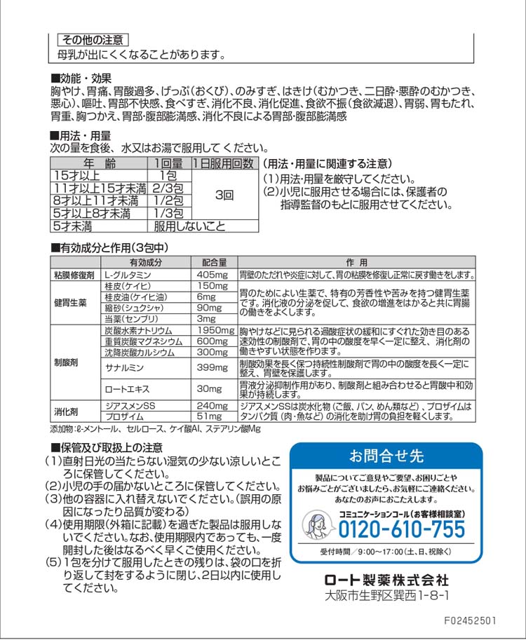 ●速効性と持続性制酸剤の配合により、胃痛・胸やけといった過酸による症状にすぐれた効果を発揮します。
