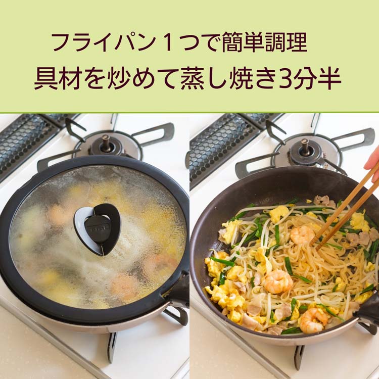 3. ふたをとり、めんをほぐしながら、もやし、ニラを加えて炒め、水気がなくなる直前で液体ソースを加える。よく混ぜ合わせて、炒めたらできあがり。