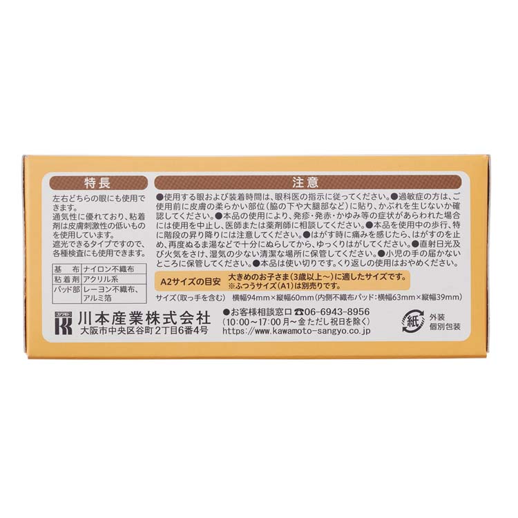 アイパッチ A-2 ベージュ 大きめ/衛生用品/【発売元、製造元、輸入元又は販売元】川本産業/・単品JAN:4987601607899/【アイパッチ A-2 ベージュ 大きめの商品詳細】●小児の視力訓練方法のひとつとして健康な眼を遮へいし、弱視眼を使用させ、視力の発達をうながす眼帯です。●直接肌に貼る「シールタイプ」です。●左右どちらの眼にも使用できます。●遮光できるタイプですので、各種検査にも使用できます。/cate20270