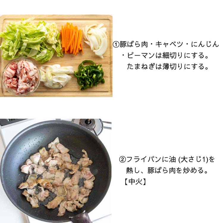 1.フライパンを熱して油大さじ1を入れ、豚肉を炒める。