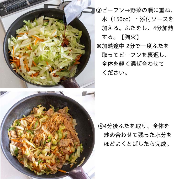 3.水150ccと添付ソースを加え、ふたをして強火で4分加熱する。