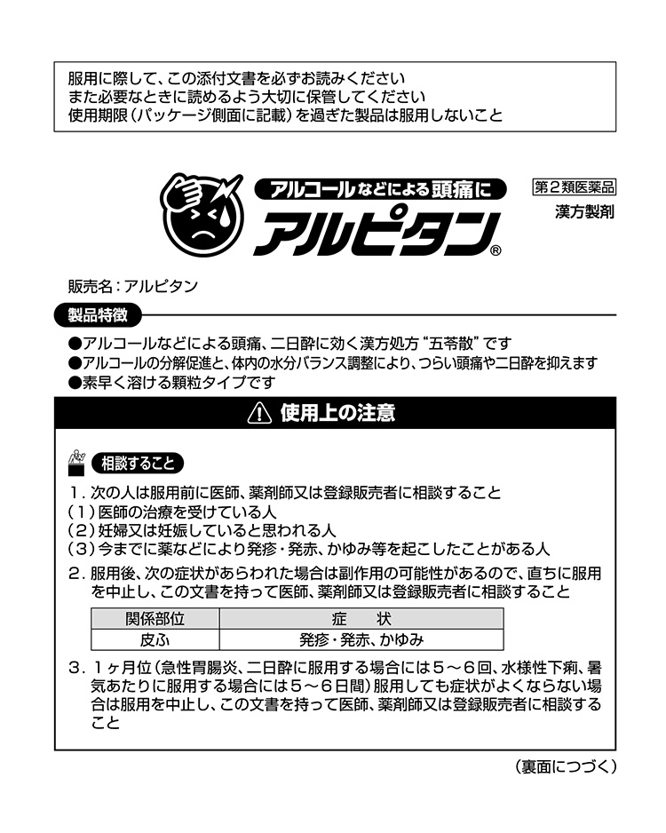 アルピタン/胃腸薬/ブランド:小林製薬/【発売元、製造元、輸入元又は販売元】小林製薬/・単品JAN:4987072046531/【アルピタンの商品詳細】●アルコールなどによる頭痛、二日酔いに効く漢方処方「五苓散」です。●アルコールの分解促進と、体内の水分バランス調整により、つらい頭痛や二日酔いを抑えます。●素早く溶ける顆粒タイプです。/cate15113