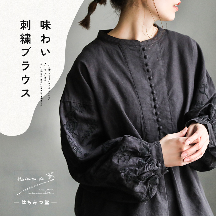 【ついに再入荷!】 はちみつ堂 味わい刺繍ブラウス レディース プルオーバー ノーカラー バンドカラー 長袖 パフスリーブ バルーンスリーブ トップス