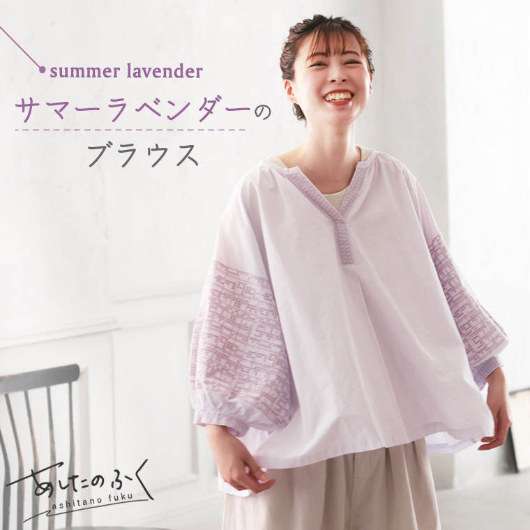あしたのふく サマーラベンダーのブラウス レディース プルオーバー 刺繍 7分袖 七分袖 バルーンスリーブ パフスリーブ スキッパー風 綿 コットン トップス